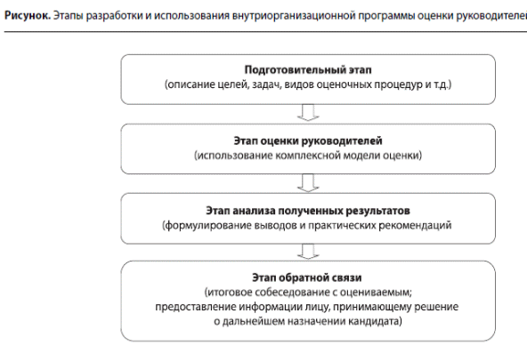 Необходимость использования комплексных моделей обусловливает применение практиками программного подхода к оценке и развитию управленческого персонала. Для каждой компании содержание программы сугубо индивидуально, однако процесс создания и использования внутриорганизационной программы оценки руководителей включает ряд общих этапов (см. рисунок).