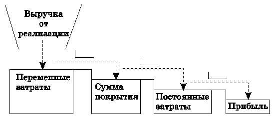 Основным инструментом для анализа затрат в директ-костинге являются суммы покрытия или, как их еще называют, маржинальная прибыль. Сумма покрытия продукта представляет собой разницу между величиной чистой выручки (без косвенных налогов и платежей) и переменных (прямых) затрат по данному продукту. Таким образом, сумма покрытия включает в себя определенную прибыль и какую-то долю "покрываемых" постоянных затрат предприятия (см. рис.7).
