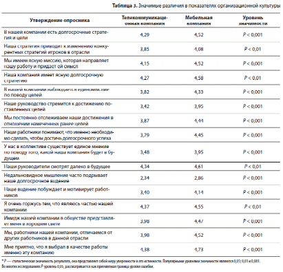 Сравнивая полученные данные двух компаний и пользуясь непараметрическими методами статистического анализа, мы обнаружили значимые различия в параметрах организационной культуры (табл. 3).