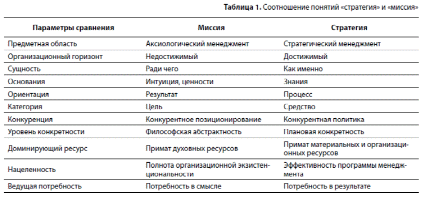 Таким образом, понятия «миссия» и «стратегия» различны, несмотря на то что оба относятся к области целеполагания и являются, соответственно, центральными понятиями аксиологического и стратегического менеджмента.