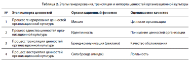 Миссия генерирует организационные ценности, которые транслируются лидерами, создают аксиологические ориентиры организационной культуры, выстраивая систему ценностной идентификации сотрудников и условия для импорта организационных ценностей во внешнюю среду (через бренд-коммуникации или прямые продажи). Таким образом, бренд — это составляющая миссии, преломленная сквозь призму организационной культуры. В табл. 2 представлены этапы генерирования, трансляции и импорта ценностей.