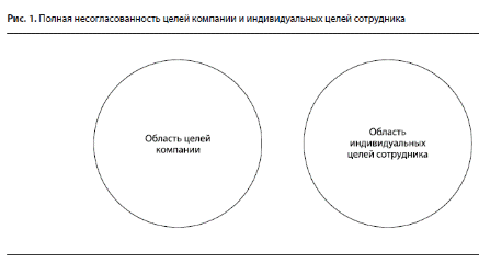 Процесс соотнесения целей компании и сотрудника может не только начинаться с полного несоответствия (см. рис.1), но и заканчиваться им, если сотрудник разочаровывается в том, что происходит в организации. Кроме того, у него зачастую появляются новые, более значимые цели, которые он не может реализовать в рамках рабочего процесса.