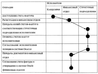 Исполнителями структурных подразделений проверяются счета-фактуры на соответствие № заказа, акцептируются при наличии акта выполненных работ (услуг), подтверждается приход товарно-материальных ценностей или его отгрузка (товар в пути), согласовывается позиция в системе Oracle Applications и в течение трех рабочих дней передается под роспись в финансовый отдел с указанием даты. В случае отсутствия у исполнителя возможности акцепта счета-фактуры в течение трех рабочих дней, он обязан согласовать дату возврата (предоставления) с финансовым отделом.