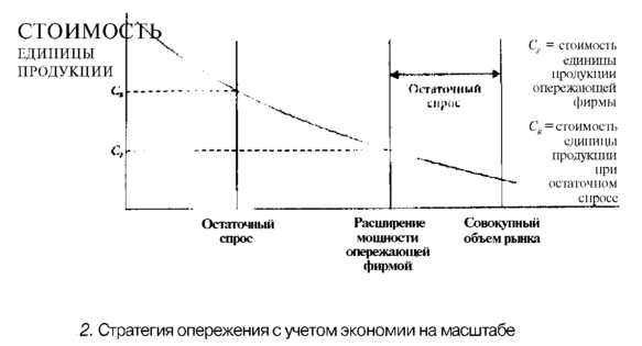 Значительная экономия на масштабе по отношению к совокупному рыночному спросу или существенная кривая обучения. Если экономия на масштабе велика по сравнению с совокупным рыночным спросом, опережающее расширение мощности может лишить конкурентов достаточной величины остаточного спроса и тем самым отнять возможность создания эффективного масштаба производства. В этом случае конкуренты, которые решили инвестировать, должны вкладывать много и рисковать вызвать кровопролитную битву за загрузку мощностей. Иначе, проводя небольшие инвестиции, они будут нести значительные издержки и постоянно оказываться в невыгодном положении по уровню затрат либо должны будут вовсе отказаться от инвестиций.