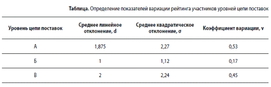 Так, из рис. 2 и таблицы видно, что наибольшим интеграционным потенциалом обладает участник анализируемой цепи поставок, функционирующий в уровне А, наименьшим интеграционным потенциалом — участник уровня Б (коэффициенты вариации соответственно 0,53 и 0,17).