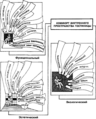 Благоприятные условия жизнедеятельности человека в гостиницах обеспечиваются благодаря созданию комфорта как в самом здании гостиницы, так и на территории, прилегающей к ней. Общий комфорт внутреннего пространства гостиниц является интегрирующим понятием. Оно включает экологический, функциональный и эстетический комфорт среды любого помещения гостиницы (рис.1)