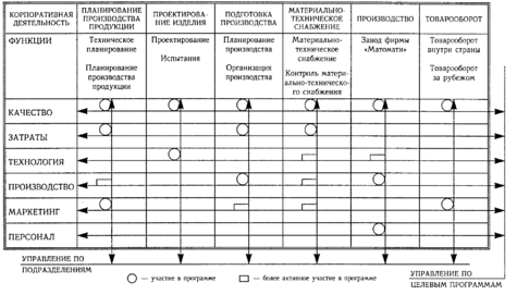 Такая структура представляет собой сетевую структуру, построенную на принципе двойного подчинения исполнителей: с одной стороны — непосредственному руководителю функциональной службы, которая предоставляет персонал и техническую помощь руководителю проекта, с другой — руководителю проекта или целевой программы, который наделен необходимыми полномочиями для осуществления процесса управления. При такой организации руководитель проекта взаимодействует с двумя группами подчиненных: с постоянными членами проектной группы и другими работниками функциональных отделов, которые подчиняются ему временно и по ограниченному кругу вопросов. При этом сохраняется их подчинение непосредственным руководителям подразделений, отделов, служб. Для деятельности, которая имеет четко выраженное начало и окончание, формируют проекты для постоянной деятельности — целевые программы. В организации и проекты, и целевые программы могут сосуществовать. Пример матричной программно-целевой структуры управления (фирма “Тойота”) приведен на рис. 3. Эта структура была предложена Каори Ишикава в 70-х гг. и с небольшими изменениями функционирует по сей день не только на фирме “Тойота”, но и на многих других фирмах по всему миру.