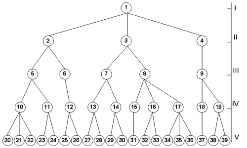 Рис. 4. Разбиение целей на подцели и задачи: I-V - уровни системы; 1-39 - элементы системы.