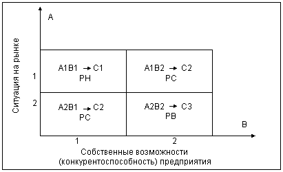 Это так называемая стратегическая матрица, или графическая сетка (рис. 5), образованная пересечением координат, которые отражают величину двух факторов, как правило, характеризующих рыночную ситуацию (А) и собственные возможности предприятия (конкурентоспособность) (В).