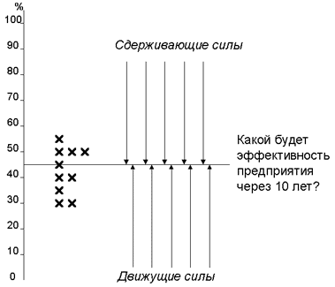 Нанесите каждую оценку, чтобы получить таким образом диаграмму рассеивания. Определите среднюю оценку и проведите горизонтальную линию, исходящую из точки на вертикальной оси, соответствующей этой оценке, напишите у правого края этой линии формулировку рассматриваемого вопроса. Проведите стрелки, “подталкивающие” вверх горизонтальную линию (движущие силы), и стрелки, “подталкивающие” горизонтальную линию вниз (сдерживающие силы).