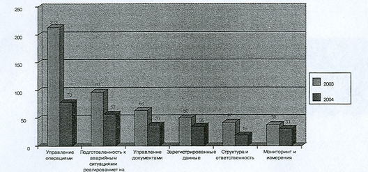 Рисунок 1. Причины несоответствий по пунктам стандарта МС ИСО 14001:1996 (Система экологического менеджмента) в ОАО «КЦБК» за 2003-2004 гг.
