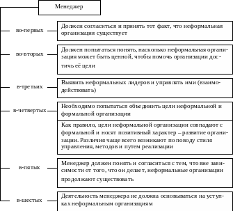 Неформальная организация в силу своей относительной особенности может выполнять как негативную функцию, так и позитивную. Задача управления заключается в том, чтобы создать такие условия, когда неформальная организация работала бы на достижение целей организации в тесном контакте с формальной организацией. Это возможно только в том случае, если менеджер не будет воспринимать неформальную организацию как «чуждый элемент», а постарается направить ее ресурсы в конструктивное русло. Это возможно только при взаимодействии управления с неформальной организацией (рис. 4).