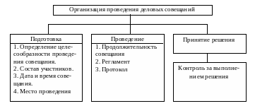 Производственные совещания носят регулярный характер – один раз в месяц, неделю. Это позволяет правильно спланировать свое рабочее время и заранее подготовить выносимые на обсуждение вопросы. Технология организации деловых совещаний приведена на рис. 8.