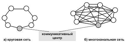 Существенным отличием децентрализованных сетей является "коммуникативное равенство" всех членов команды, а коммуникативный центр играет роль держателя информации, к которой все имеют доступ. Основными видами децентрализованной сети являются круговая и многоканальная модели (см. рис. 1.9).