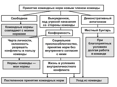 Особенно остро проблема принятия командных норм встает перед новым членом команды. Можно говорить о трех вариантах его поведения (см. рис. 1.12):