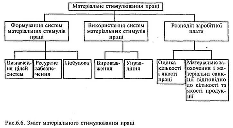 Однією з найважливіших форм мотивації в організаціях є матеріальне стимулювання праці, яке являє собою процес формування і використання систем матеріальних стимулів праці та розподілу заробітної плати відповідно до дії закону розподілу за кількістю і якістю праці (рис.6.6).