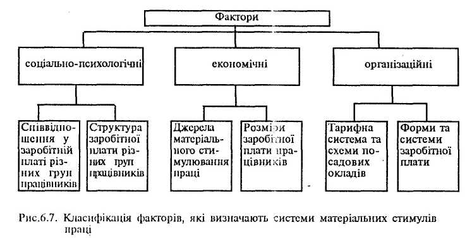 Розв'язання проблем матеріального стимулювання праці потребує пошуку і дослідження факторів, які визначають системи матеріальних стимулів. Під даними факторами розуміють рушійні сили, які забезпечують формування і використання всієї сукупності спонукальних мотивів з мстою задоволення колективних та особистих економічних інтересів працівників. Вивчення й аналіз розвитку матеріального стимулювання праці свідчать, що за характером дії на колективи працівників та окремих виконавців можна виділити три групи факторів: соціально-психологічні, економічні й організаційні (рис.6.7).