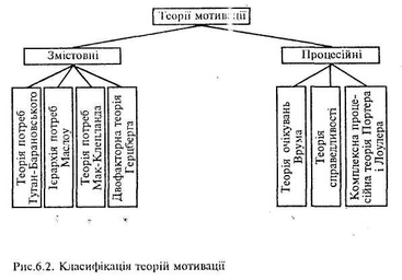 Протягом розвитку менеджменту склалась обґрунтована система теорії мотивації, яка є основою розробки прикладних механізмів мотивування працівників. Класифікація теорій мотивації з виділенням груп змістовних та прецесійних теорій подана на рис.6.2. Спочатку розглянемо змістовні теорії.