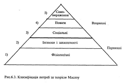 Ієрархію потреб за Маслоу характеризує рис.6.3.