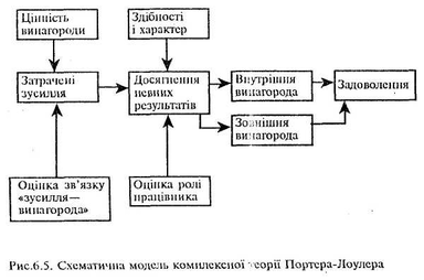 Комплексна теорії Портера—Лоулсра базується на моделі, яка показана на рис.6.5. Модель враховує цінність винагород, зв'язки «зусилля—винагорода», здібності, характер, роль працівника.