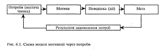 Потреби бувають первинні (фізіологічні) і вторинні (психологічні), а винагороди — внутрішні (дає сама робота: зміст трудового процесу, самоповага тощо) і зовнішні (дає організація: зарплата, кар'єра, кабінет, службове авто, додаткова відпустка тощо). Узагальнену модель мотивації через потреби можна зобразити рис.6.1.