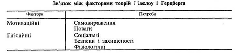 Гігієнічні фактори пов'язані із середовищем, яке оточує працівника, а мотивації — зі змістом самої роботи. Між теориями Маслоу і Герцберга є певний зв'язок, який характеризується табл.6.