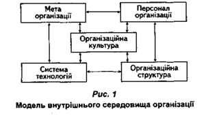 Отже, основою потенціалу організації цілком справедливо можна вважати організаційну культуру. Саме вона дає змогу вирізнити одну організацію від іншої; саме з урахуванням філософії, на якій ґрунтується, формуються мета й завдання організації; завдяки потенціям, закладеним у її основні цінності, члени організації згуртовуються й мобілізують свої зусилля у складний час і постійно готові до сприйняття нового (як у сфері технологій, так і в принципах роботи) у відносно спокійний період; завдяки високій організаційній культурі можлива така децентралізація управління, яка забезпечує гнучкість і оперативність фірми, краще використаний її ресурсів, творчого потенціалу працівників, а також можливостей, що їх надає зовнішнє середовище. Модель внутрішнього середовища підприємства з виділенням організаційної культури як ключового й завершального його елементу зображено на рис. 1.