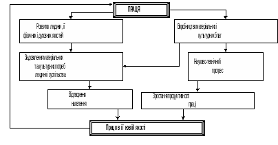 Широко застосовуються сьогодні малі форми підприємництва, які вирішують нагальні задачі створення додаткових робочих місць і забезпечення зайнятості населення, та на жаль, у значно меншому ступені формують умови для впровадження досягнень науково-технічного прогресу у виробництво. Така ідеальна схема впливу праці на людину і суспільства. Вона представлена на рис. 1.