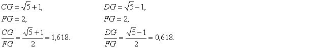 Можно построить прямоугольник, стороны которого связаны золотым отношением. Такой прямоугольник по определению будет являться "золотым прямоугольником". Стороны "золотого прямоугольника" имеют отношение 1,618 к 1. Чтобы построить "золотой прямоугольник", первоначально строится квадрат со сторонами, равными двум единицам. Затем проводится линия от середины одной стороны квадрата к одной из его вершин, образующих противоположную сторону, как показано на рисунке 2. В построенных таким образом прямоугольниках стороны связаны "золотым коэффициентом". В итоге, и прямоугольник AFGC, и прямоугольник BFGD являются "золотыми".
