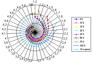 Рисунок 5. Графическое изображение динамики соответствия объема продукции величине относительной цены при изменении уровня прибыльности в диапазоне от 0% до 100%