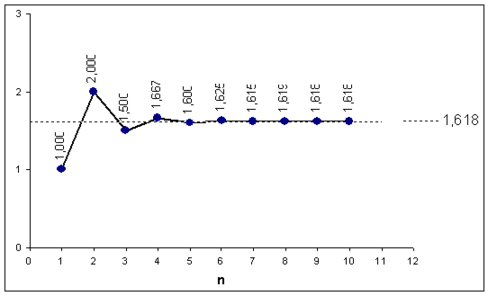 отношение любого числа последовательности к следующему приближается к 0,618 (после первых четырех чисел). Например: 1/1= 1; 1/2 = 0,5; 2/3 = 0,67; 3/5 = 0,6; 5/8 = 0,625; 8/13 = 0,615; 13/21 = 0,619 и т.д. Обратим внимание, как значение соотношений колеблется вокруг величины 0,618, причем размах флуктуации постепенно сужается (рис. 4);
