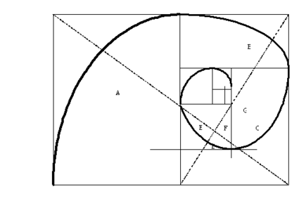 Нарисованные в результате квадраты закручиваются внутрь, как они помечены на рис. 3. (A, B, C, D, E, F и G). В любой точке золотой спирали отношение длины дуги к ее диаметру равно 1,618. Отношение диаметров и радиусов, отстоящих друг от друга на 90?, в свою очередь, равно 1,618, что и показано на рис. 3.