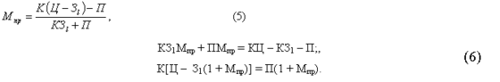 Согласно подходу, предложенному в работе, примем следующие обозначения: К - объем выпуска продукции за рассматриваемый период; Ц - цена единицы продукции; П - постоянные затраты, относимые к рассматриваемой продукции за данный период; Р - абсолютное значение прибыли за рассматриваемый период; Ссб - себестоимость продукции (при объеме выпуска К единиц); З1 - переменные удельные затраты на единицу продукции; Мпр - планируемая норма прибыли (рентабельность, заданная в виде десятичной дроби ); раскроем состав числителя и знаменателя в выражении для Мпр: