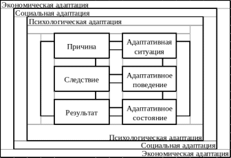 Иерархия уровней адаптации зависит от важности каждого из них. Прежде всего, адаптация человека - это психофизиологический процесс. Так как адаптация человека протекает в обществе - это социальный процесс. Жизнь общества и человека немыслима без экономической деятельности, т. е. труда. Поэтому всякая адаптация в широком смысле имеет экономический аспект.
