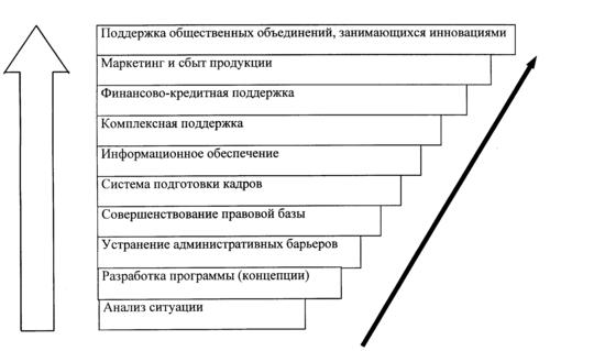 При этом первостепенным объектом государственной поддержки на начальном этапе должны стать разработки, близкие к завершению, реально применимые в производстве, осваиваемые в сжатые сроки. Коммерциализация инноваций через малое предпринимательство будет способствовать быстрой окупаемости вложений при ограниченных объемах финансирования. При успешном осуществлении ряда первых инновационно-технологических проектов малые предприятия смогут более активно модернизировать производство и вкладывать средства в НИОКР.