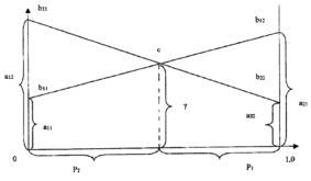 5) Визначається ордината точки перетину с. Вона й дорівнюватиме ціні гри у. Абсциса точки с дорівнює p2 (p1 = 1 - р2).