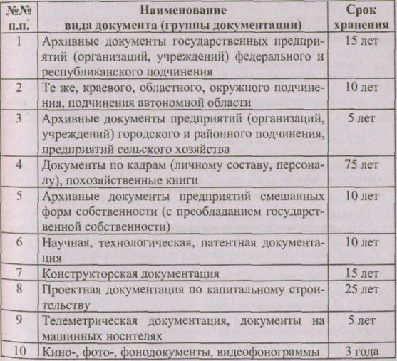 Таблица 11. Сведения о сроках хрипения основных видов документов, а архиве предприятии