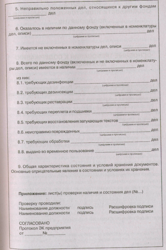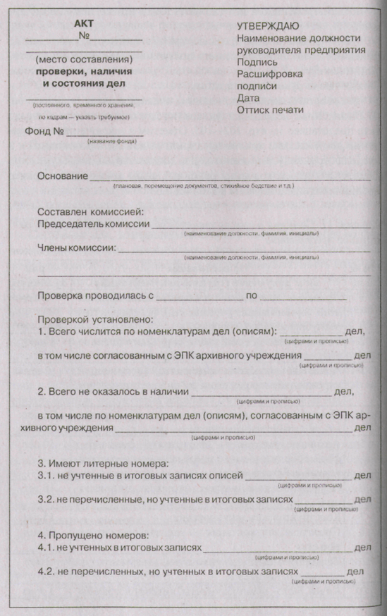 Состояние дел, возвращаемых в архив после получения во временное пользование, должно быть проверено в присутствии лиц возвращающего дело. Проверке подлежат комплектность дела (об разующих его документов) и состояние дела на предмет отсутствия— механических и иных повреждений. Выявленные недостатки фиксируются в акте. Кроме того, с целью проверки общего наличия состояния дел (документов) в архиве проводятся регулярные проверки, в ходе которых устанавливаются фактическое наличие документов, соответствие фактического наличия дел документ-данным учета, количество дел документов, подлежащих реставрации и (или) профилактической обработке, а также количество обнаруженных документов".
