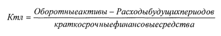 Превышение оборотных активов над краткосрочными финансовыми обязательствами обеспечивает резервный запас для компенсации убытков, которые может понести предприятие при размещении и ликвидации всех оборотных активов, кроме наличности. Чем больше величина этого запаса, тем больше уверенность кредиторов, что долги будут погашены. Удовлетворяет обычно коэффициент больше 2-х.