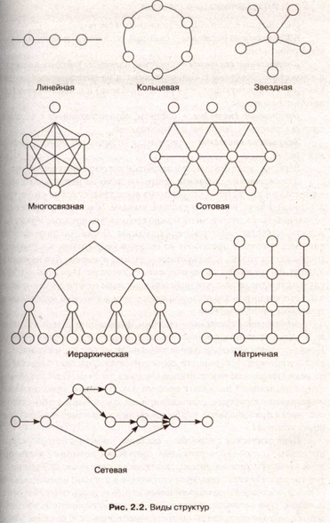 Методика вычленения системообразующих отношений из окружающей среды зависит от того, о чем идет речь: о проектировании еще не существующей системы или об анализе системного представления известного объекта, материального или идеального. Существуют различные виды структур. Наиболее известные из них представлены на рис. 2.2.