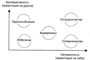 Созданная с целью улучшения управления делами на производстве и в бизнесе «решетка менеджмента» была удачно интерпретирована для различения стратегий поведения в конфликте (рис. 3).