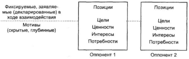 Мотивы в конфликте — это побуждения к вступлению в конфликт, связанные с удовлетворением потребностей оппонента, совокупность внешних и внутренних условий, вызывающих конфликтную активность субъекта. В конфликте часто сложно, выявить истинные мотивы оппонентов, так как они в большинстве случаев скрывают их, предъявляя в позициях и декларируемых целях мотивировку участия в конфликте, которая отличается от первичных мотивов (рис. 2).