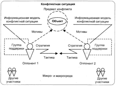 Важными психологическими составляющими конфликтной ситуации являются устремления сторон, стратегии и тактики их поведения, а также их восприятие конфликтной ситуации, т. е. те информационные модели конфликта, которые имеются у каждой из сторон и в соответствии с которыми оппоненты организуют свое поведение в конфликте.