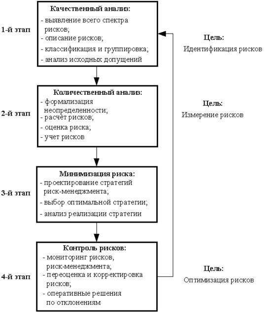Итак, значение любого риска для каждого участника индивидуально, а общий риск инновационного проекта есть сложная система частных (в том числе, индивидуальных) рисков со сложными многочисленными связями. Система риск-менеджмента инновационного проекта должна содержать стадии в соответствии с рисунком 3 [6].