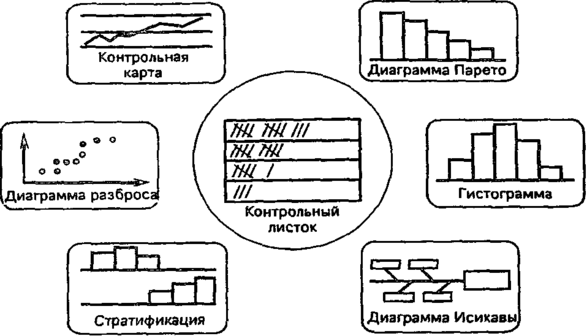Многие из современных статистических методов довольно сложны для восприятия, а тем более для широкого применения всеми участниками процесса. Японские ученые отобрали из всего множества семь методов. Их заслуга, и в первую очередь, профессора Исикавы, состоит в том, что они обеспечили простоту, наглядность, визуализацию этих методов, превратив их фактически в эффективные инструменты контроля качества (рис. 1). Их можно понять и эффективно использовать без специальной математической подготовки.