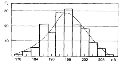 Если на рис. 3 кроме гистограммы нанести еще и полигон, то по мере роста числа измерений одновременно уменьшается ширина класса, и полигон превращается в так называемую кривую плотности вероятностей, представляющую собой кривую теоретического распределения (штриховая линия на рис.3). Заметим, что площадь, ограниченная полигоном и осью