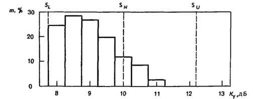 на этот тип усилителей, равный 10 дБ. Номинальное значение представляет собой математическое ожидание, т.е. среднее значение коэффициента усиления для данного типа усилителя при его производстве, которое можно рассматривать как генеральную характеристику, а совокупность всех значений коэффициентов усилений выпускаемых усилителей — генеральную совокупность. В ТУ установлены также допустимые пределы изменения коэффициента усиления: нижняя граница допуска