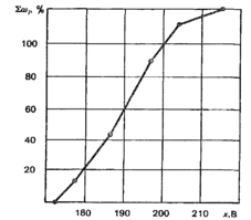 График накопленных частот представляет собой кумулятивную кривую (кумуляту). Часто ее называют интегральной кривой. Кумулятивная кривая строится как для дискретного, так и для непрерывного изменения значений параметра. При этом следует отметить, что накопленные частоты (частости) интервального ряда относятся не к серединам интервалов, а к верхним границам каждого из них. Высота последней ординаты соответствует объему наблюдений всего ряда, или 100 %. Зависимость на рис. 4 представляет собой полигон, построенный на основе таблиц накопленных частот, и носит название накопленного полигона, а ломаная кривая (штриховая линия) представляет собой кумулятивную кривую. Кумулятивная кривая имеет более плавный характер изменения, чем гистограмма или полигон частот, ибо накопление приводит к сглаживанию. Значения накопленных частот, соответствующих одно-, двух- и трехкратному стандартному отклонению значения параметра качества от среднего значения исследуемого статического ряда, наносят на нормальную вероятностную бумагу.