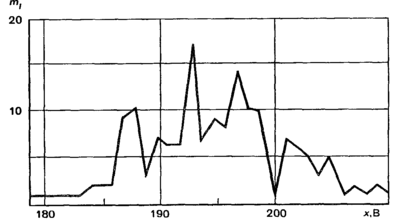 Полигоны, как правило, применяют для отображения дискретных изменений значений случайной величины, но они могут использоваться и при непрерывных (интервальных) изменениях. В этом случае ординаты, пропорциональные частотам интервалов, восстанавливаются перпендикулярно оси абсцисс в точках, соответствующих серединам данных интервалов. Вершины ординат соединяются прямыми линиями. Для замыкания кривой крайние ординаты соединяются с близлежащей серединой интервала, в которой частота равна нулю. Пример изображения значений пробивного напряжения в виде полигона, приведен на рис. 2.