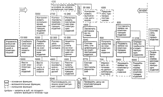 При помощи тестов «Как?», «Зачем?», «Когда?» отсеиваются излишние и несвойственные функции. Функции, не отвечающие ни на один из этих вопросов, должны быть изъяты из диаграммы и состава функций отдела, так как относятся к категории излишних или несвойственных. Все основные функции по направлению слева направо должны отвечать на вопрос «Как?», а по направлению справа налево — на вопрос «Зачем?». Все вспомогательные функции должны отвечать на вопрос «Когда?» (когда возможно осуществление основной функции?). В случае необходимости количество тестов можно увеличить.